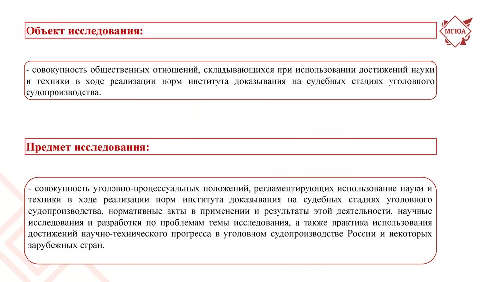 Объект исследования:- совокупность общественных отношений, складывающихся при использовании достижений науки