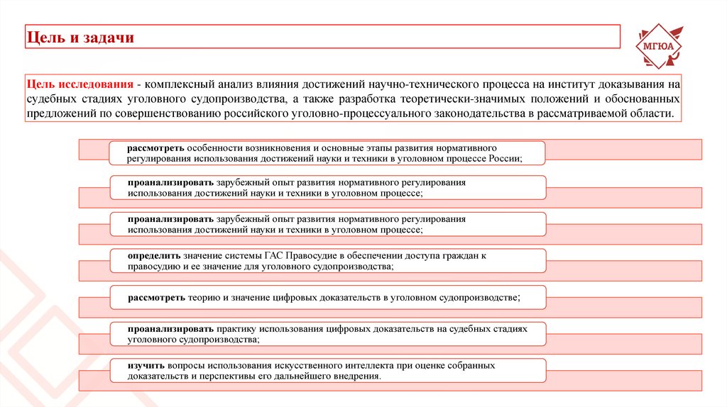 Цель и задачиЦель исследования - комплексный анализ влияния достижений научно-технического процесса на институт доказывания на