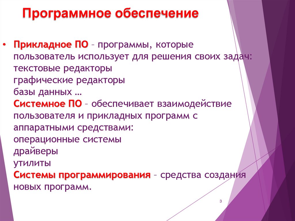 3. Прикладное ПО – программы, которые пользователь использует для решения своих задач: текстовые редакторы графические редакторы