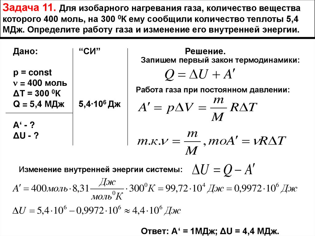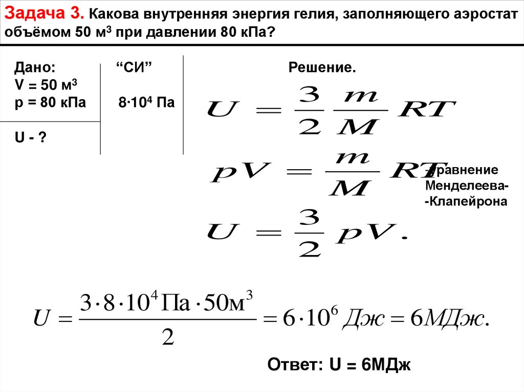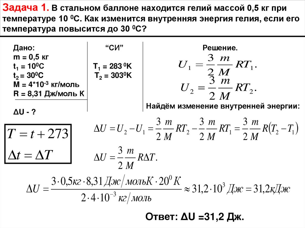 Задача 1. В стальном баллоне находится гелий массой 0,5 кг притемпературе 10 0С. Как изменится внутренняя энергия гелия, если его