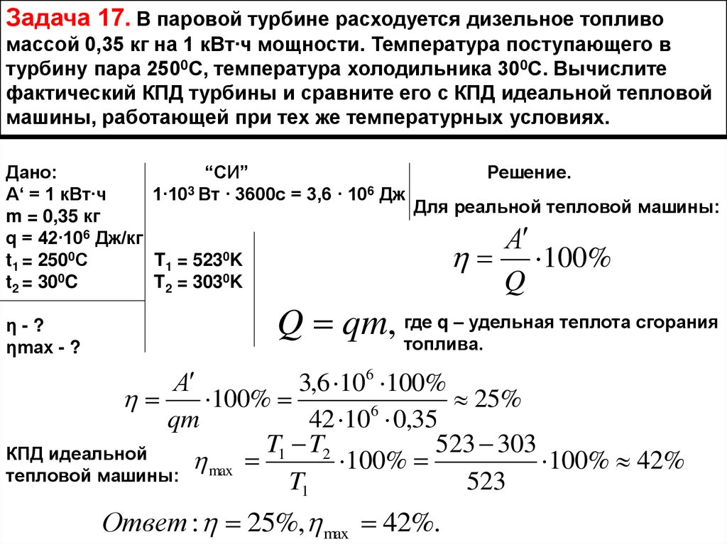 Задача 17. В паровой турбине расходуется дизельное топливомассой 0,35 кг на 1 кВт∙ч мощности. Температура поступающего в