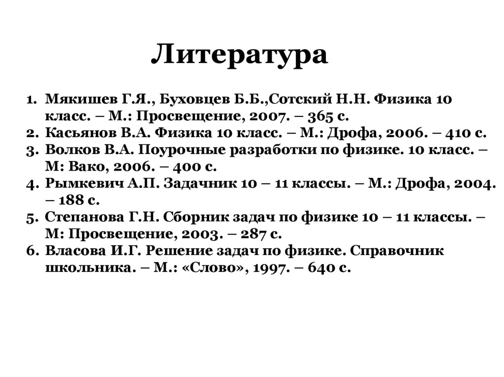 Литература1. Мякишев Г.Я., Буховцев Б.Б.,Сотский Н.Н. Физика 10