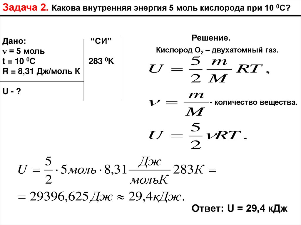 Задача 2. Какова внутренняя энергия 5 моль кислорода при 10 0С?Дано: