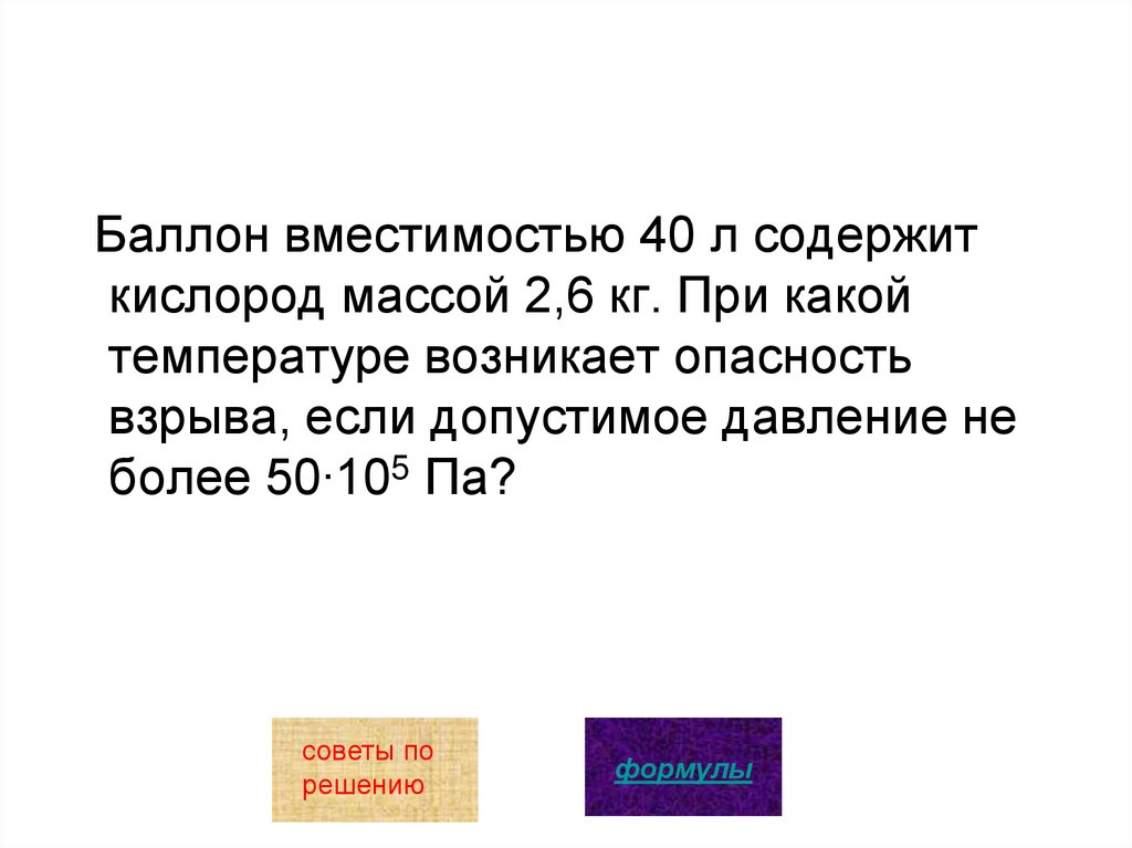 Баллон вместимостью 40 л содержиткислород массой 2,6 кг. При какой