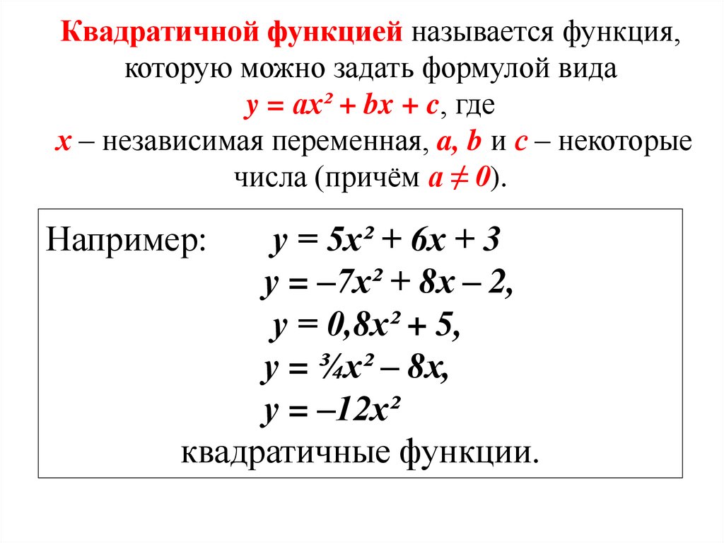 Квадратичной функцией называется функция,которую можно задать формулой вида