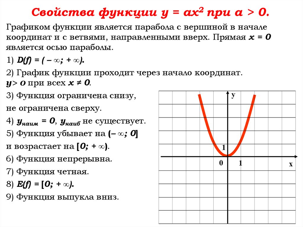 Свойства функции у = ах2 при а > 0.Графиком функции является парабола с вершиной в начале
