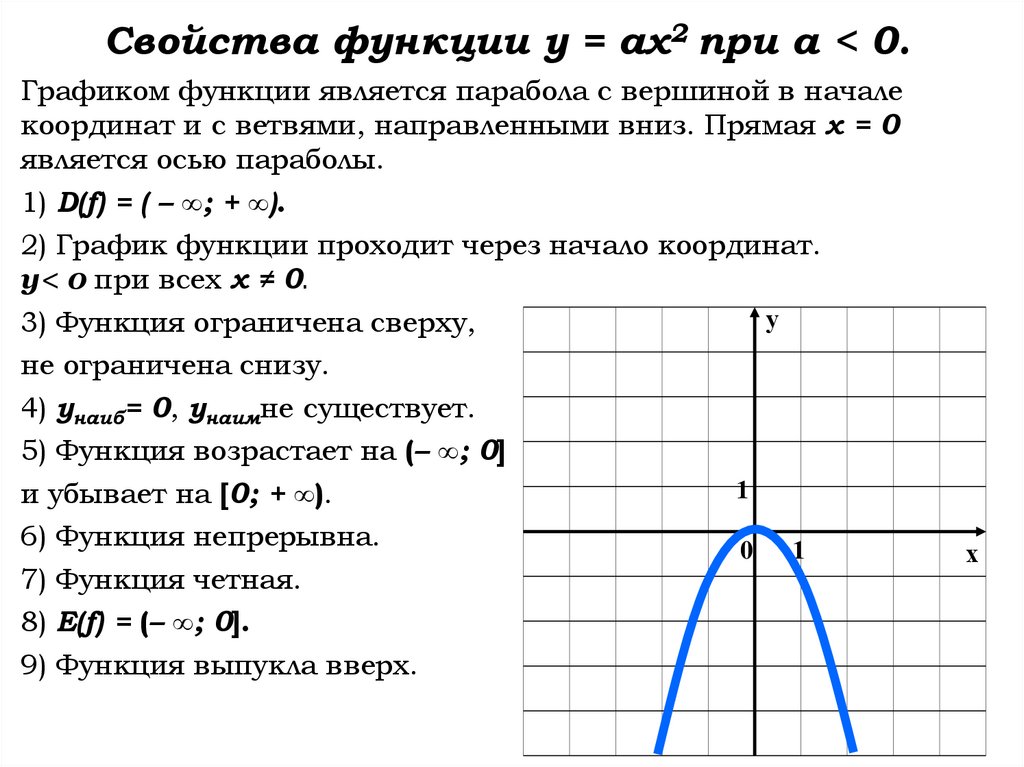 Свойства функции у = ах2 при а < 0.Графиком функции является парабола с вершиной в начале
