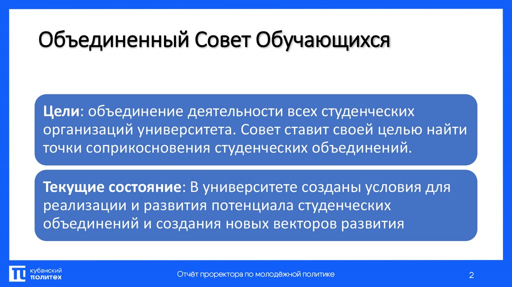 Объединенный Совет ОбучающихсяЦели: объединение деятельности всех студенческих