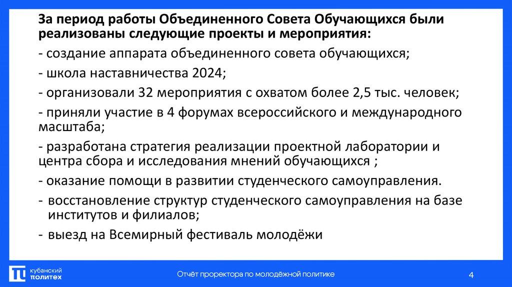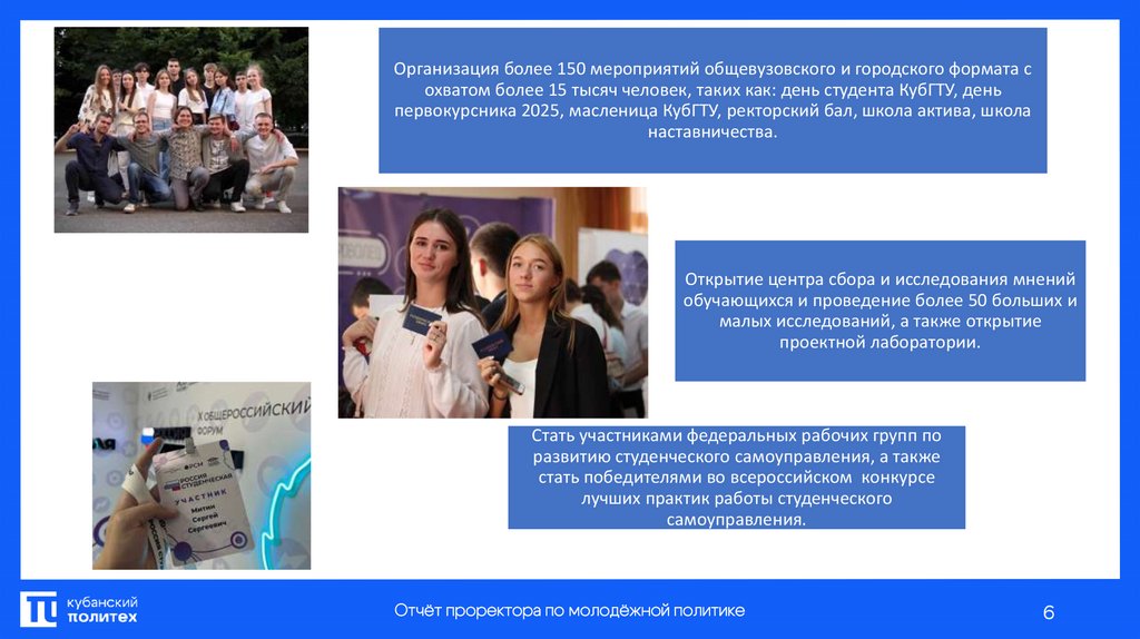 Организация более 150 мероприятий общевузовского и городского формата сохватом более 15 тысяч человек, таких как: день студента КубГТУ, день