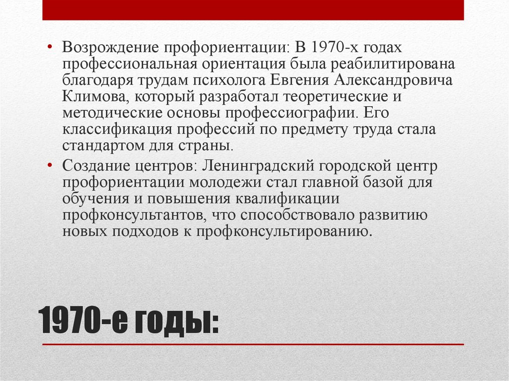 • Возрождение профориентации: В 1970-х годахпрофессиональная ориентация была реабилитирована