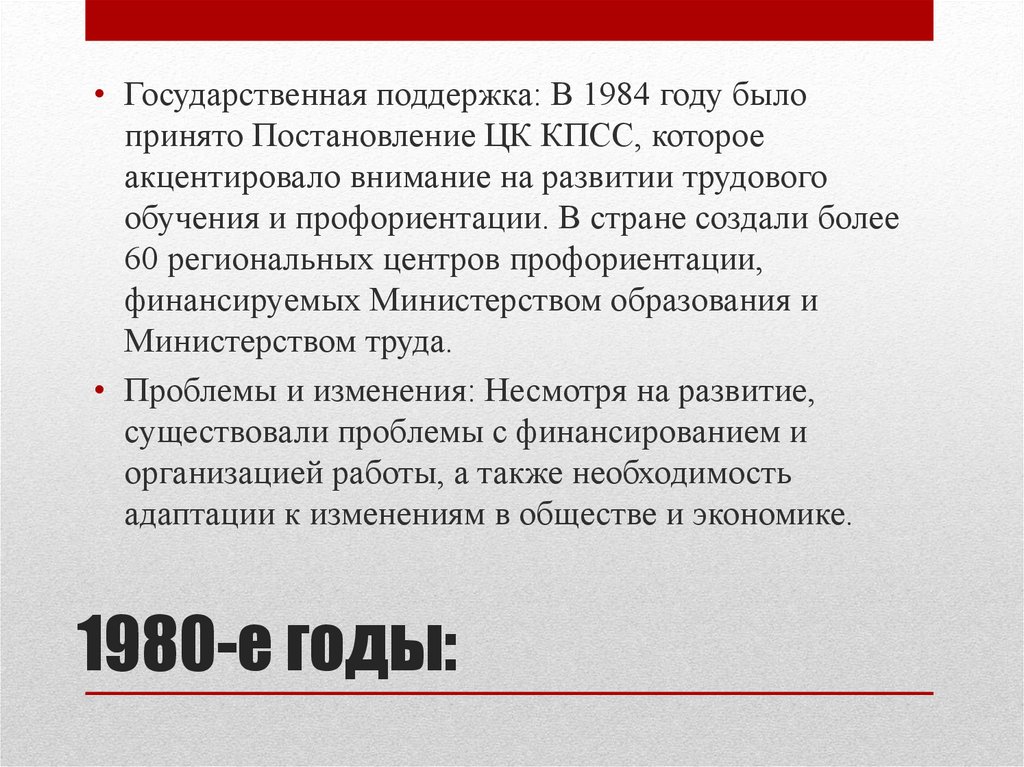 • Государственная поддержка: В 1984 году былопринято Постановление ЦК КПСС, которое