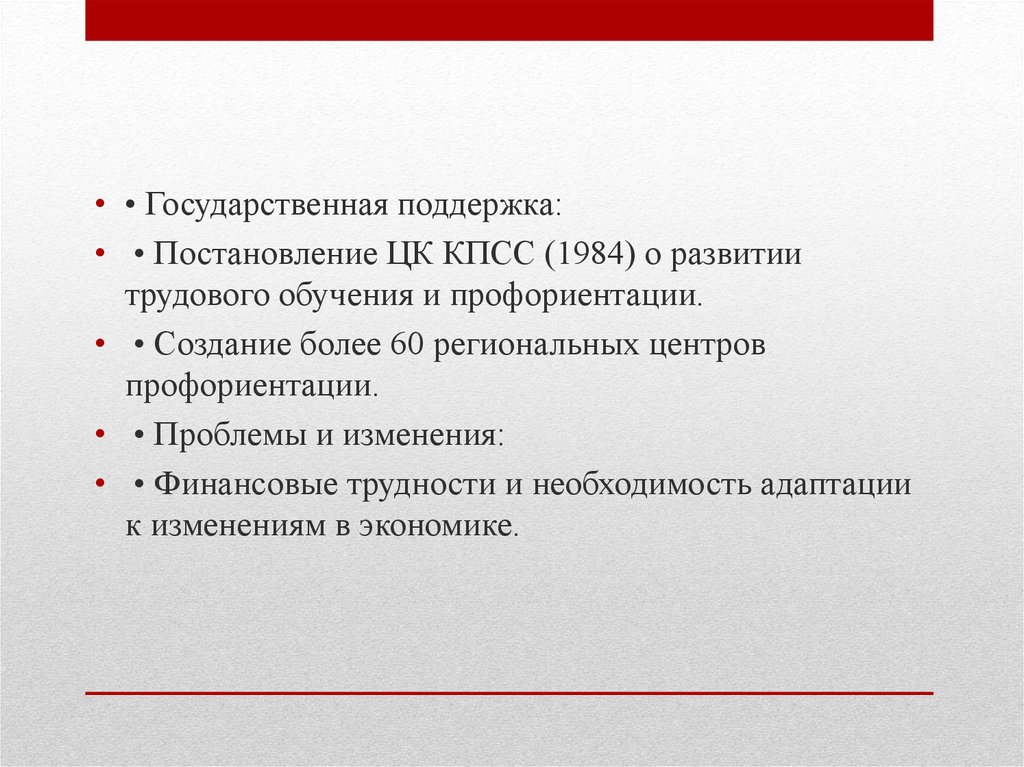 • • Государственная поддержка:• • Постановление ЦК КПСС (1984) о развитии