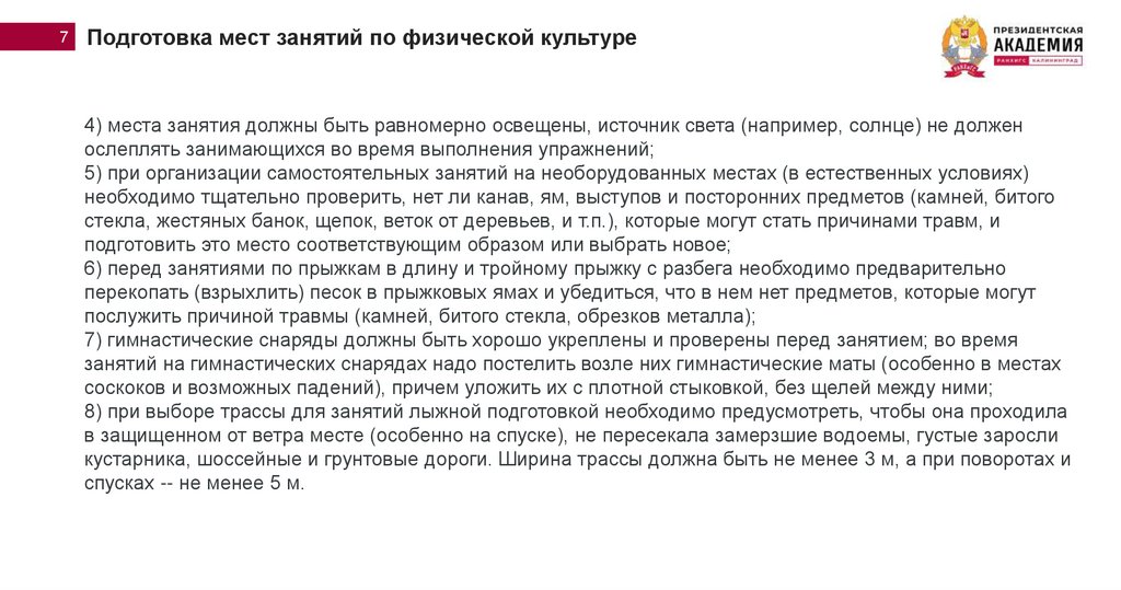 Необходимо соблюдать следующие основные правила подготовки мест занятий по физической