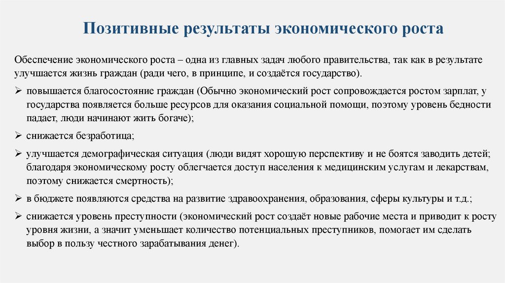 Позитивные результаты экономического ростаОбеспечение экономического роста – одна из главных задач любого правительства, так как в результате