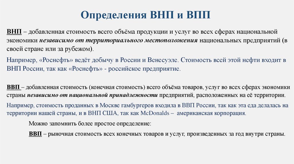 Определения ВНП и ВППВНП – добавленная стоимость всего объёма продукции и услуг во всех сферах национальной