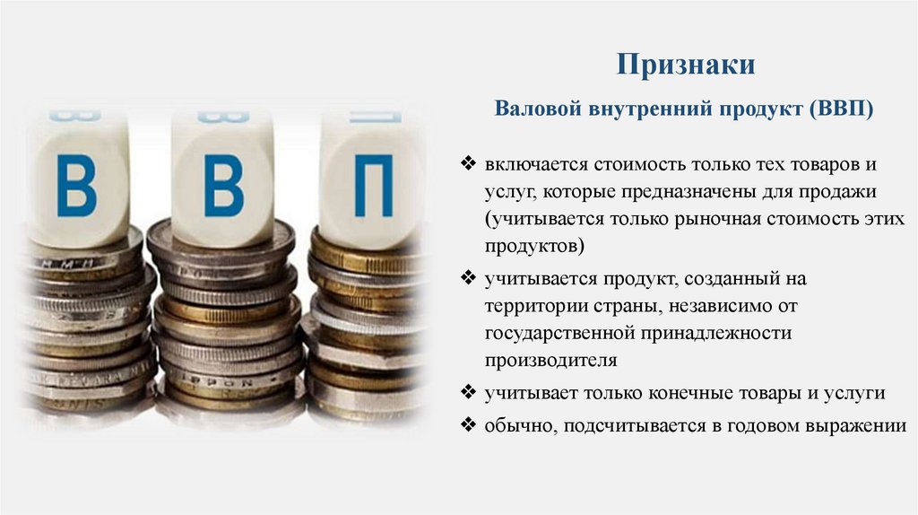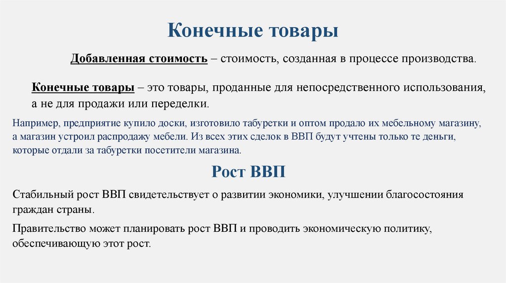 ВВП – рыночная стоимость всех конечных товаров и услуг, произведенных за год внутри страны.