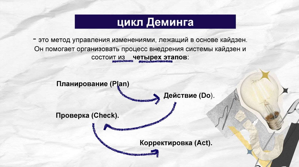 цикл Деминга- это метод управления изменениями, лежащий в основе кайдзен.