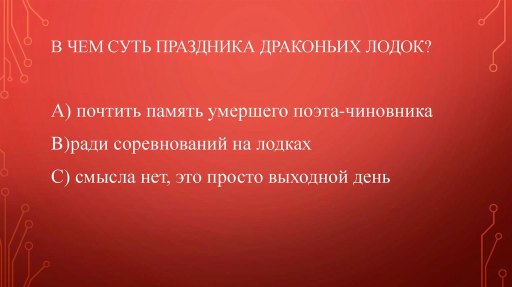 В ЧЕМ СУТЬ ПРАЗДНИКА ДРАКОНЬИХ ЛОДОК?А) почтить память умершего поэта-чиновника
