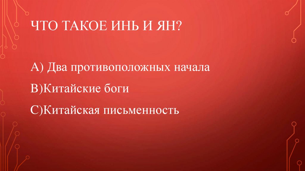 ЧТО ТАКОЕ ИНЬ И ЯН?A) Два противоположных начала