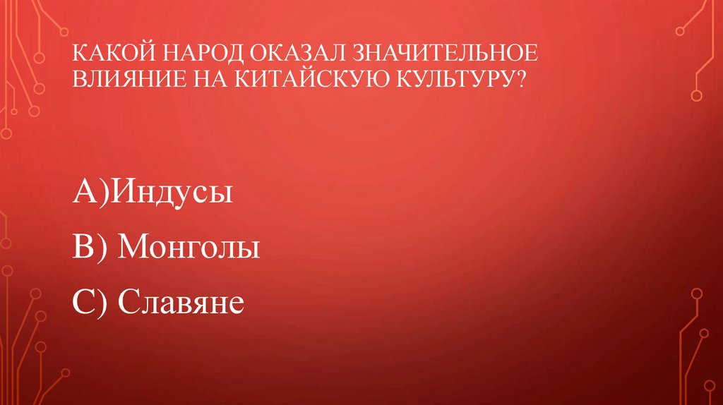 КАКОЙ НАРОД ОКАЗАЛ ЗНАЧИТЕЛЬНОЕВЛИЯНИЕ НА КИТАЙСКУЮ КУЛЬТУРУ?