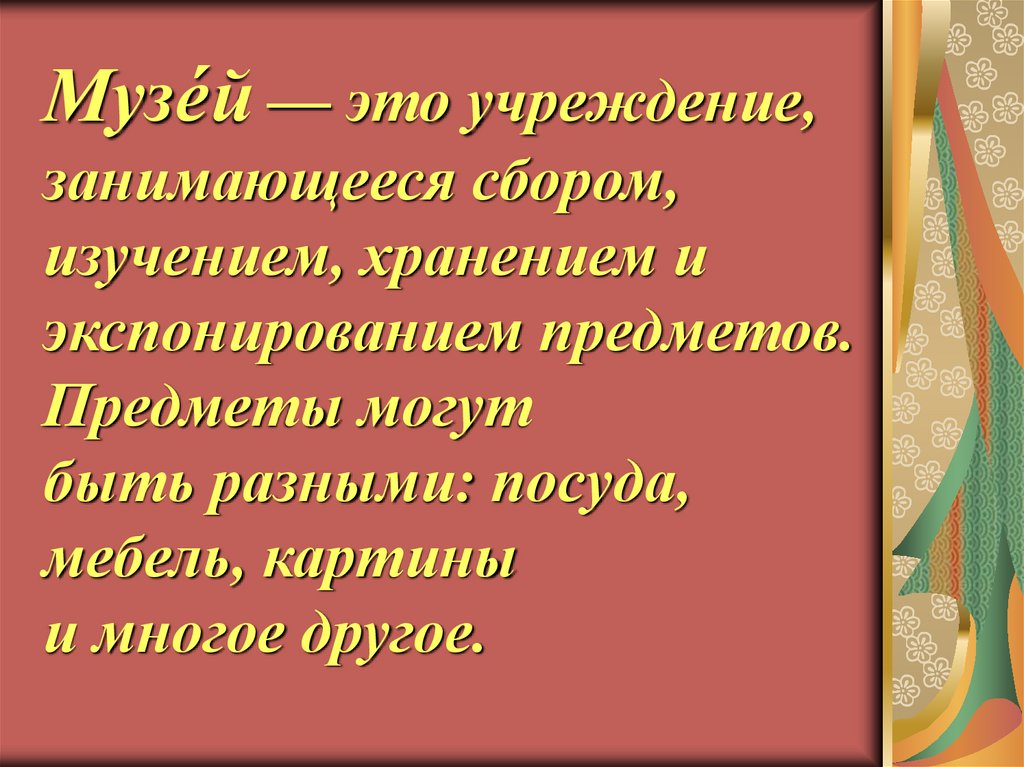 Музе́й — это учреждение,занимающееся сбором,