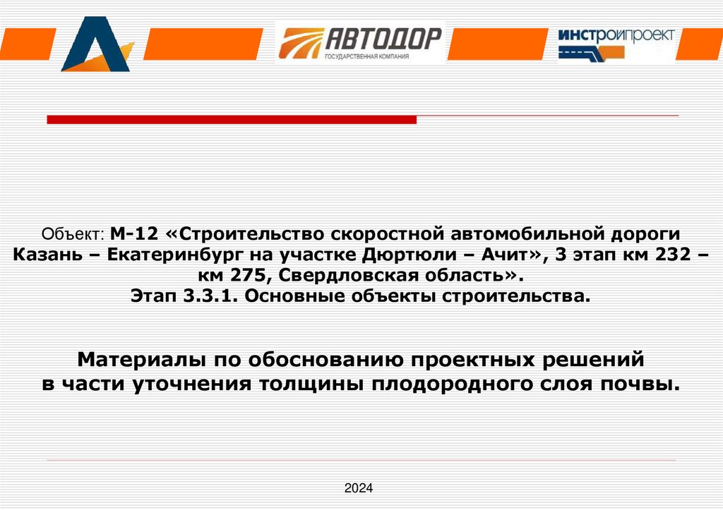 1. Объект: М-12 «Строительство скоростной автомобильной дороги Казань – Екатеринбург на участке Дюртюли – Ачит», 3 этап км 232 –