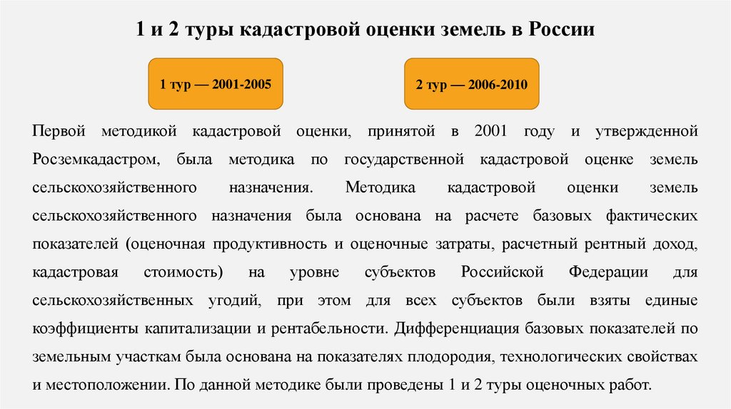 1 и 2 туры кадастровой оценки земель в России1 тур — 2001-2005