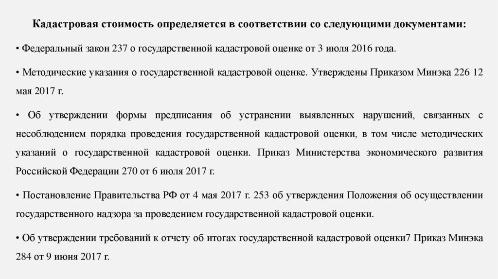 Кадастровая стоимость определяется в соответствии со следующими документами:• Федеральный закон 237 о государственной кадастровой оценке от 3 июля 2016 года.