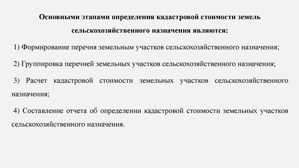 Основными этапами определения кадастровой стоимости земельсельскохозяйственного назначения являются: