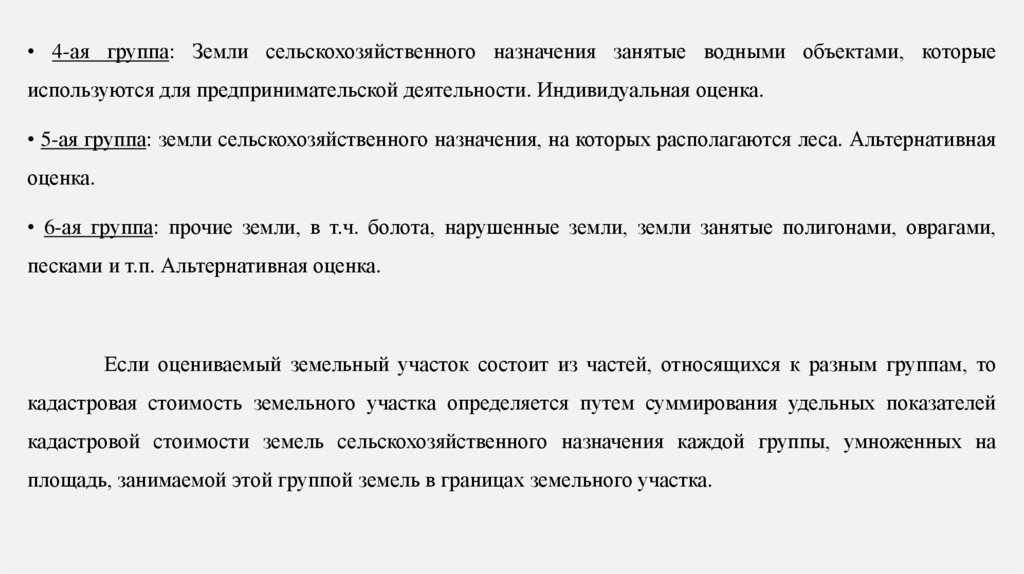 • 4-ая группа: Земли сельскохозяйственного назначения занятые водными объектами, которыеиспользуются для предпринимательской деятельности. Индивидуальная оценка.