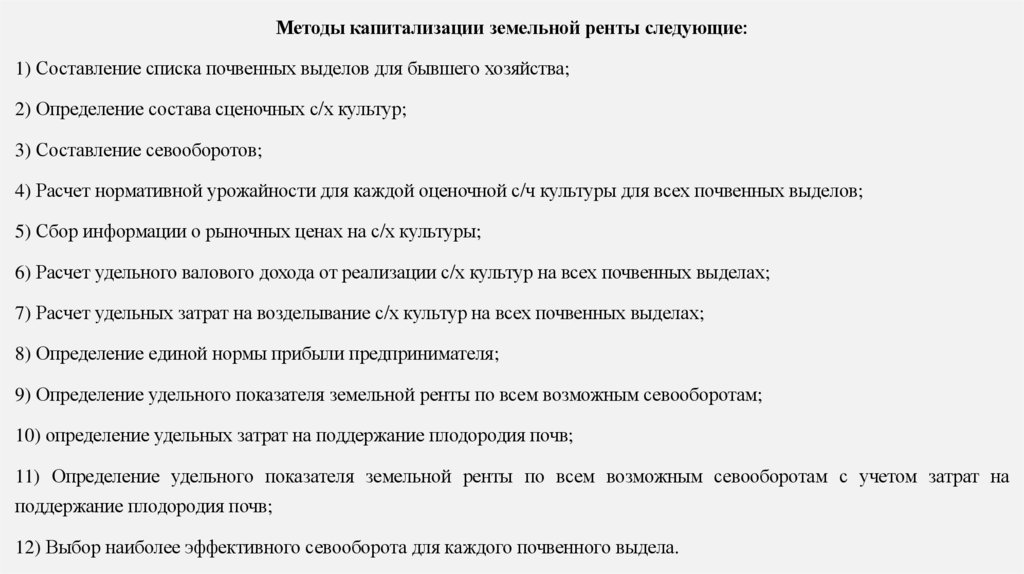 Методы капитализации земельной ренты следующие:1) Составление списка почвенных выделов для бывшего хозяйства;