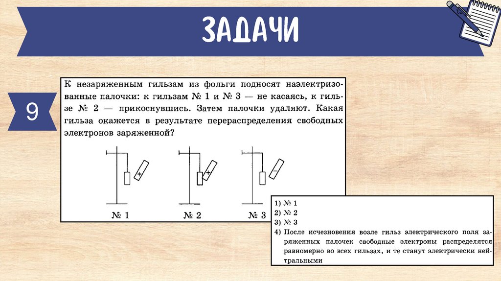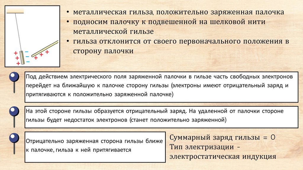 • металлическая гильза, положительно заряженная палочка• подносим палочку к подвешенной на шелковой нити