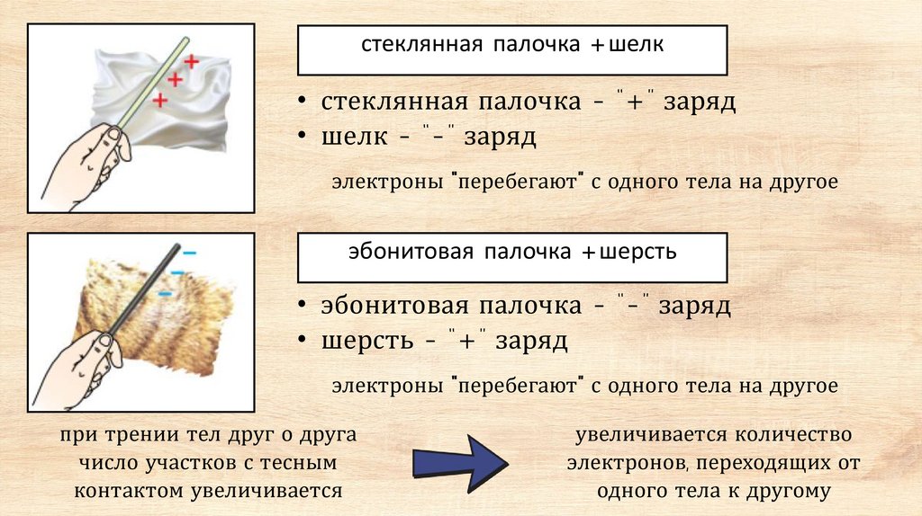 стеклянная палочка + шелк• стеклянная палочка - “+” заряд