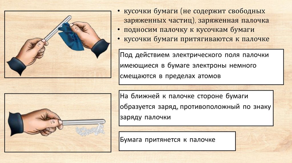 • кусочки бумаги (не содержит свободныхзаряженных частиц), заряженная палочка