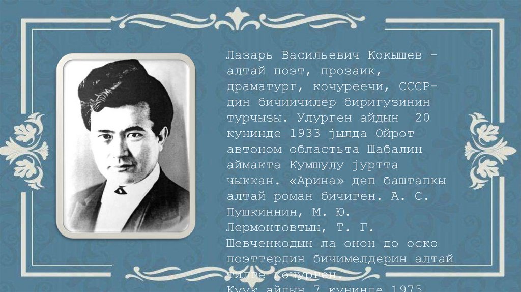 Лазарь Васильевич Кокышев –алтай поэт, прозаик,