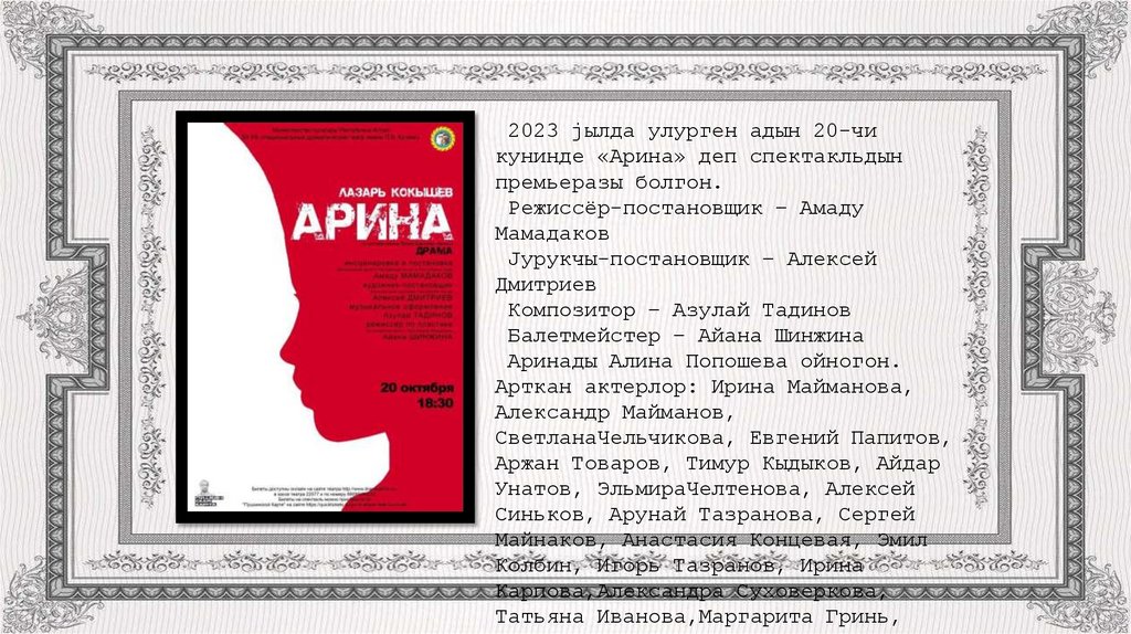 2023 jылда улурген адын 20-чикунинде «Арина» деп спектакльдын