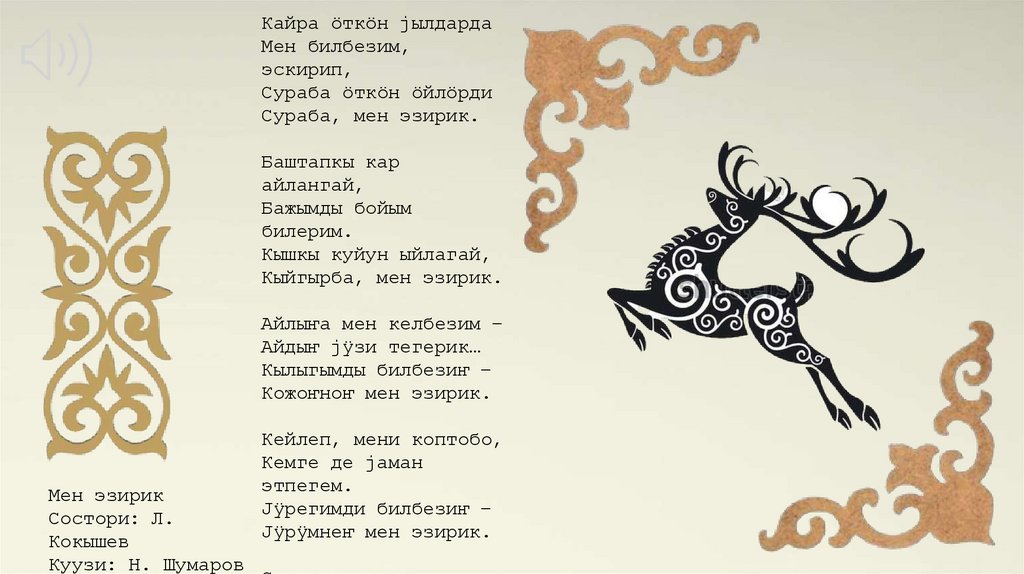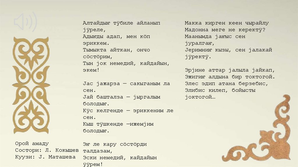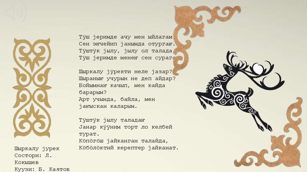 Тÿш jеримде ачу мен ыйлагамСен эҥчейип jанымда отургаҥ.