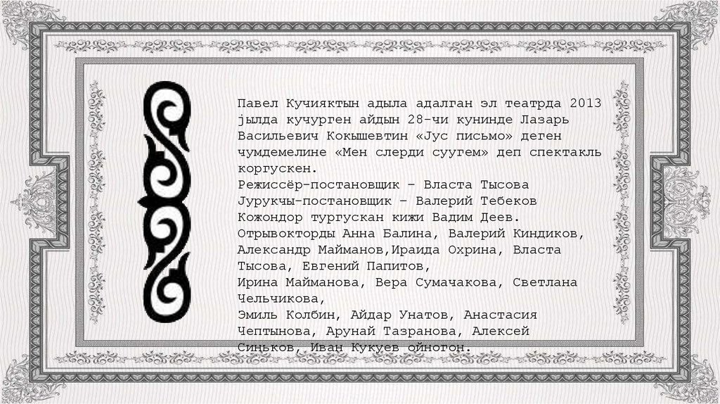 Павел Кучияктын адыла адалган эл театрда 2013jылда кучурген айдын 28-чи кунинде Лазарь