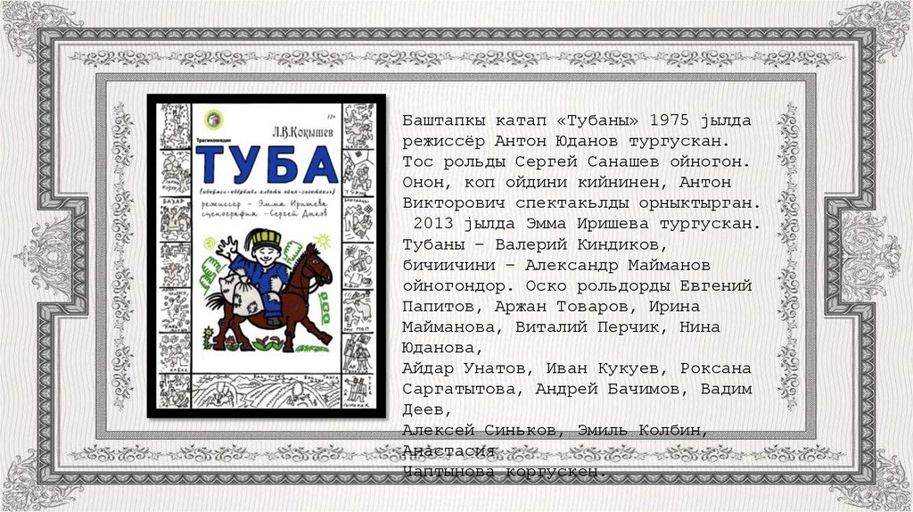 Баштапкы катап «Тубаны» 1975 jылдарежиссёр Антон Юданов тургускан.