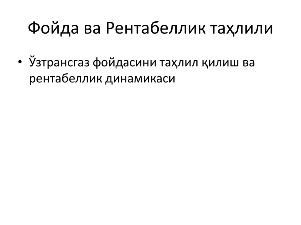 Фойда ва Рентабеллик таҳлили• Ўзтрансгаз фойдасини таҳлил қилиш ва
