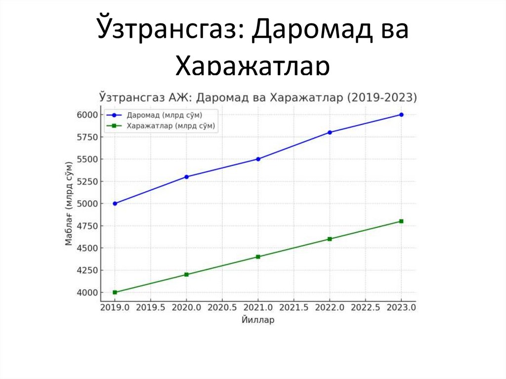 Даромад ва Харажатлар таҳлили• Ўзтрансгазнинг 2019-2024 йиллар молиявий