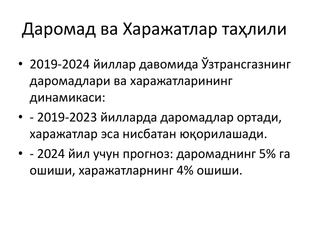 Даромад ва Харажатлар таҳлили• 2019-2024 йиллар давомида Ўзтрансгазнинг