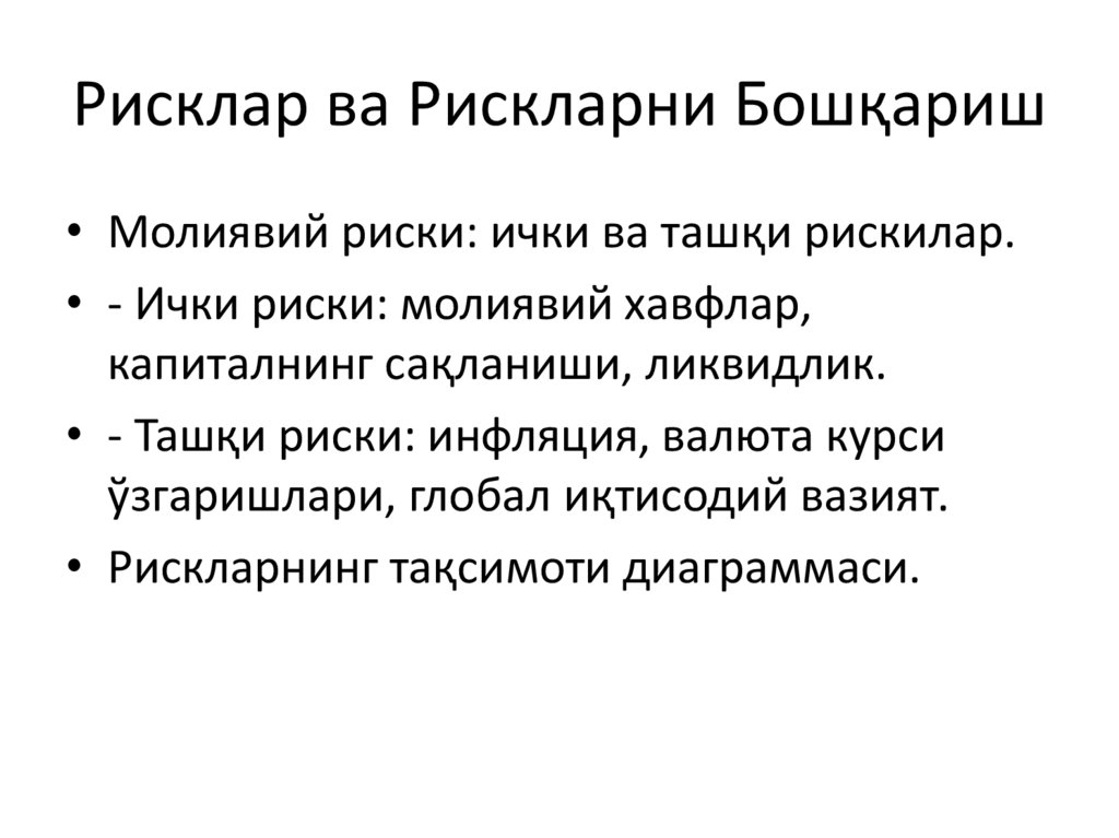 Рисклар ва Рискларни Бошқариш• Молиявий риски: ички ва ташқи рискилар.