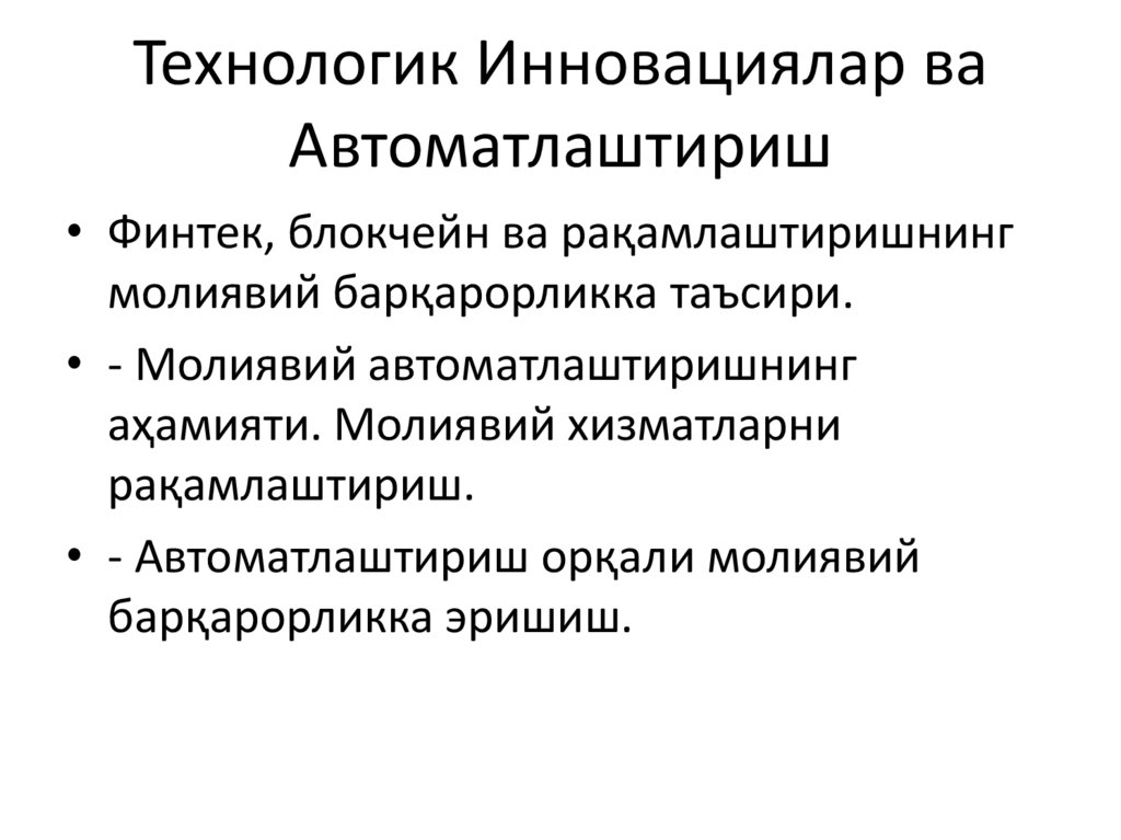 • Финтек, блокчейн ва рақамлаштиришнинг