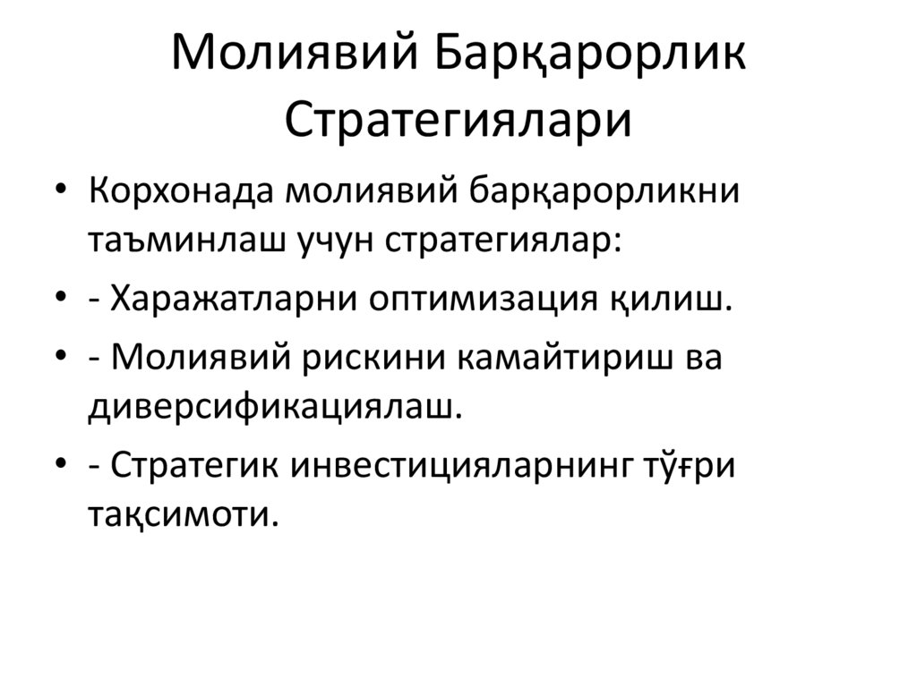 • Корхонада молиявий барқарорликни