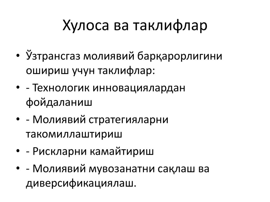 Хулоса ва таклифлар• Ўзтрансгаз молиявий барқарорлигини