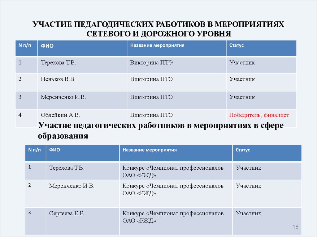 18. УЧАСТИЕ ПЕДАГОДИЧЕСКИХ РАБОТИКОВ В МЕРОПРИЯТИЯХ СЕТЕВОГО И ДОРОЖНОГО УРОВНЯ