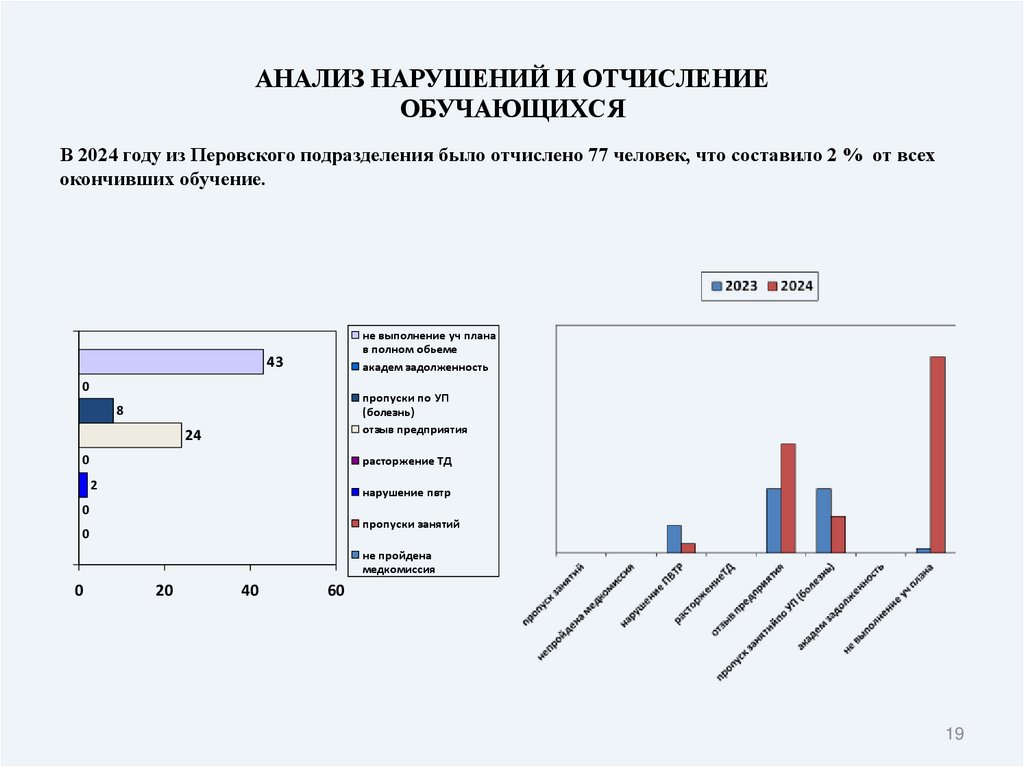 В 2024 году из Перовского подразделения было отчислено 77 человек, что составило 2 % от всехокончивших обучение.