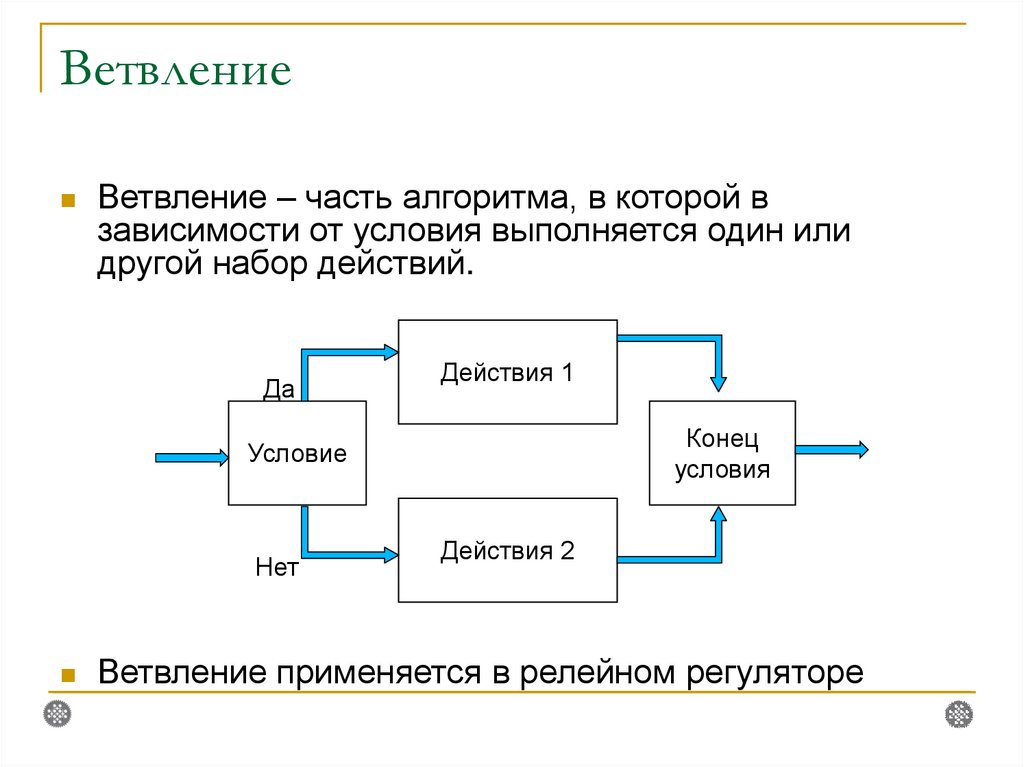 Ветвление – часть алгоритма, в которой взависимости от условия выполняется один или