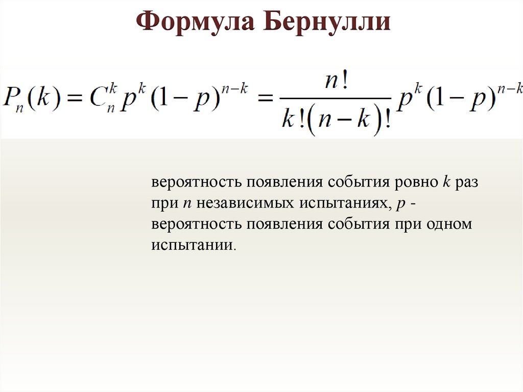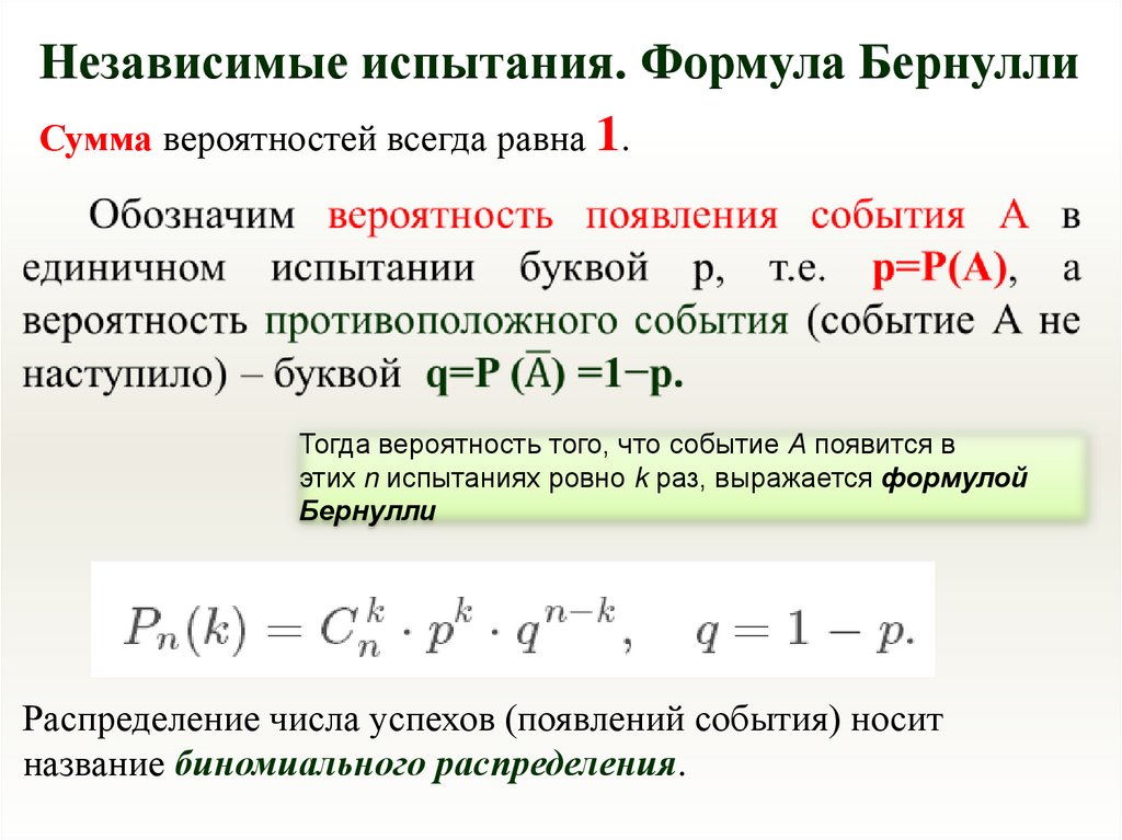 Независимые испытания. Формула БернуллиСумма вероятностей всегда равна 1.